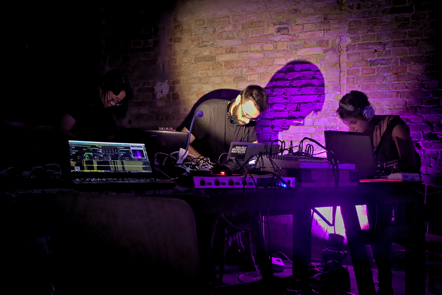 Inspired by their participation in the radio art festival Radio Revolts 2016 (Halle) and the live programme “SAVVY Funk” (Berlin) as part of the dokumenta14 Radio Project (2017), the group has been working on their own live improvisations since the beginning of 2017. One of the constants of the performance is the inclusion of the sound of the location and the instruments and objects used. The recording or broadcasting begins with enter- ing the room, including setting up the setup. Thus electronic instruments such as drum machines and com- puters become sound generators even before electricity begins to flow through them. Everything is allowed as an instrument or sound generator: soundscapes, voices, oscillators, live streams, samplers, effect devices.